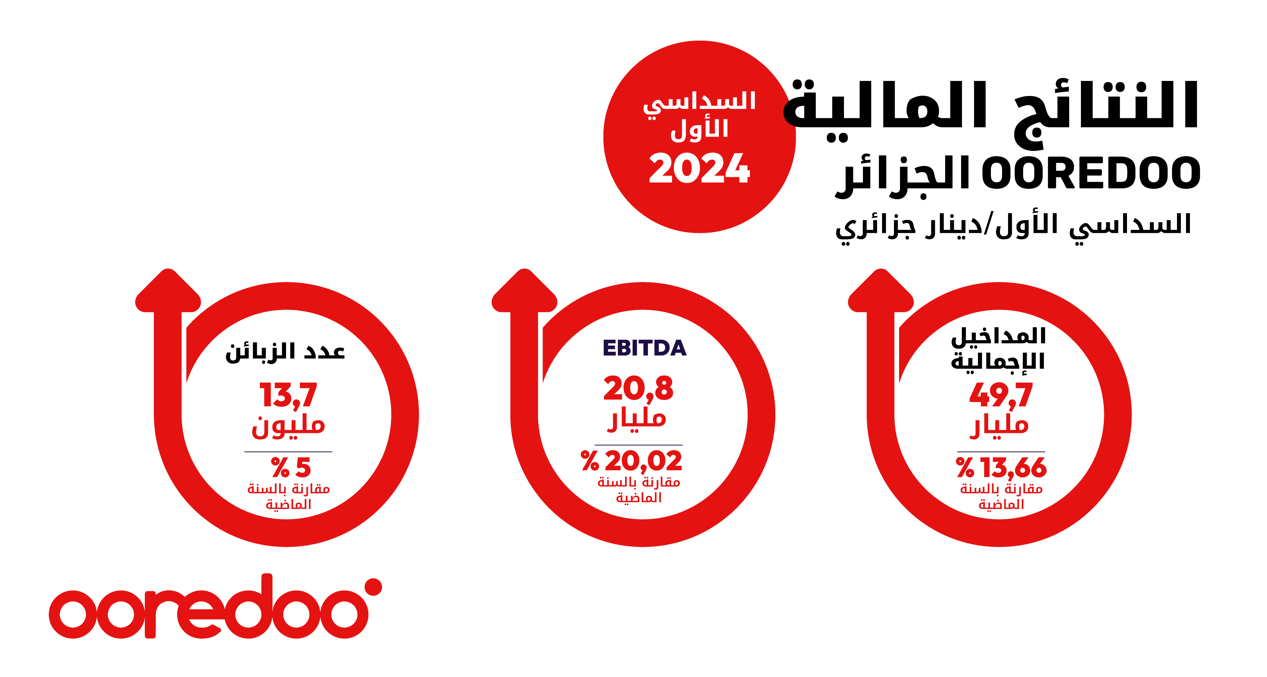 " تؤكد النتائج المالية لمؤسسة Ooredoo الجزائر خلال السداسي الأوّل لسنة 2024 عن النمو المتواصل لأهم مؤشراتها المالية، يؤكد هذا النمو برقمين سواء فيما يخص الإيرادات أو الأرباح قبل احتساب الفوائد والضرائب والاستهلاك والإطفاء، عن نجاعة استراتيجيتنا والتزام فرقنا وهو ما يسمح لنا بالتطلع إلى المستقبل بكل ثقة. كما سنواصل مجهوداتنا لتعزيز مكانتنا في السوق الجزائرية وذلك من خلال تعزيز استثماراتنا في مجالات الرقمنة والابتكار وتطوير خدمات جديدة تتطابق مع متطلبات زبائننا."