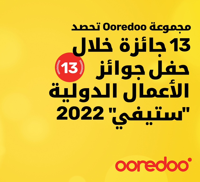 أعلنت مجموعة Ooredoo عن فوزها بـ 13 جائزة خلال حفل جوائز الأعمال الدولية "ستيفي" 2022، حيث حصدت المجموعة وشركاتها 3 جوائز ذهبية، و3 فضية، و6 جوائز برونزية، وجائزة ضمن فئة "اختيارات الجمهور".