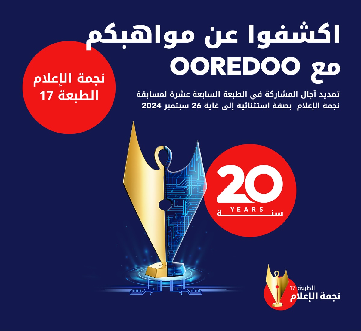 بناءً على طلب العديد من الصحفيين الذين عبّروا عن رغبتهم في الاستفادة من وقت إضافي قصد إتمام أعمالهم وبعد موافقة لجنة التحكيم، قرّرت مؤسسة Ooredoo الجزائر تمديد آجال المشاركة في الطبعة السابعة عشر لمسابقة نجمة الاعلام، بشكل استثنائي، إلى غاية يوم 26 سبتمبر 2024.