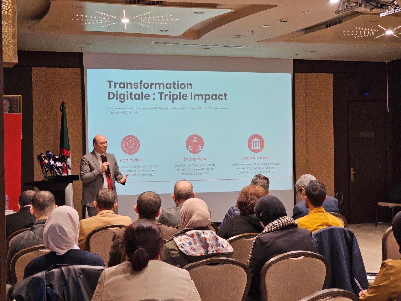 Il a ensuite abordé les perspectives et l’état actuel de la transformation digitale en Algérie, notamment en termes d’infrastructures numériques, les Startups, la formation dans le numérique, l’adoption des TIC et Cybersécurité, ainsi que les principaux points entravant l’écosystème numérique tels que le coût et l’instabilité des infrastructures techniques, la réglementation, l’infrastructure de paiement limitée, l’accès au financement ainsi que la résistance au changement.